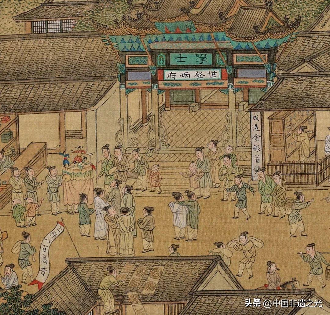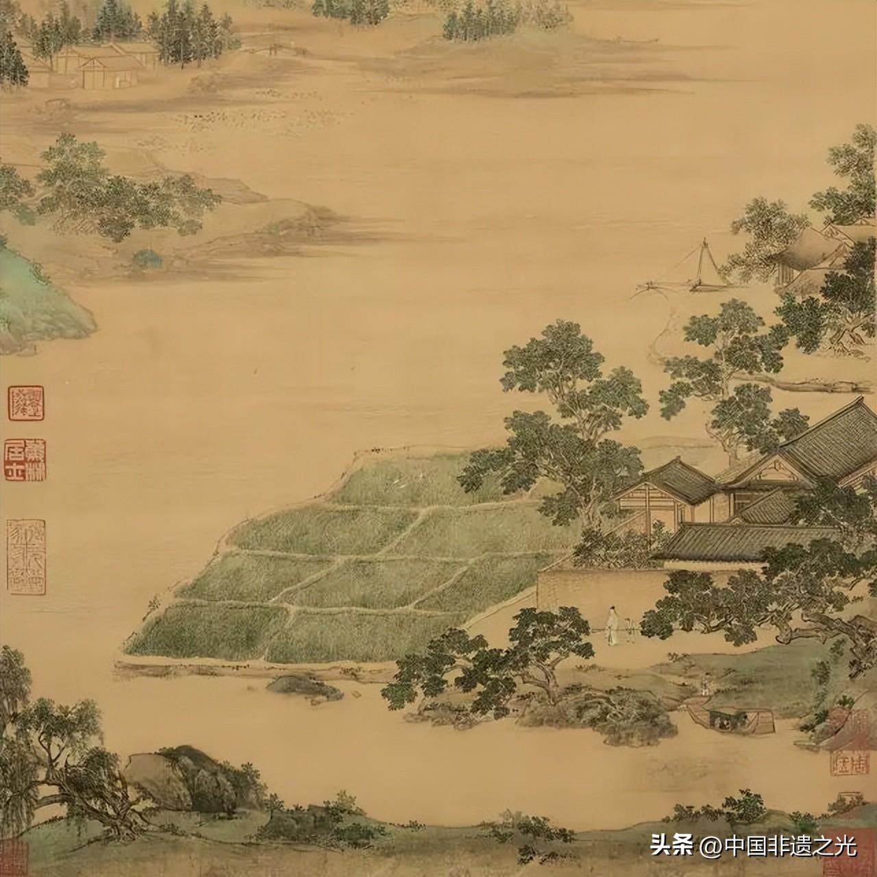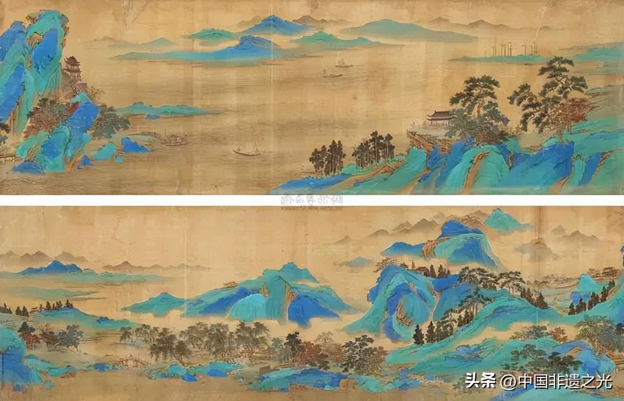仇英最爲今人稱道的便是其“青綠”技法,他也將這種顏色運用於長卷人物場景中,他的配色總是很好看,這種敏感得益於其早年漆工的出身。其實,在我們今天看來,這些傳統器物之美非常迷人,精工細作的雅緻已成絕唱,所以能作出好漆器的人,他的畫畫當然不會差,加之仇英後天的勤奮與悟性,證明了即使是天才確實也是由99%的汗水塑造的真理。
