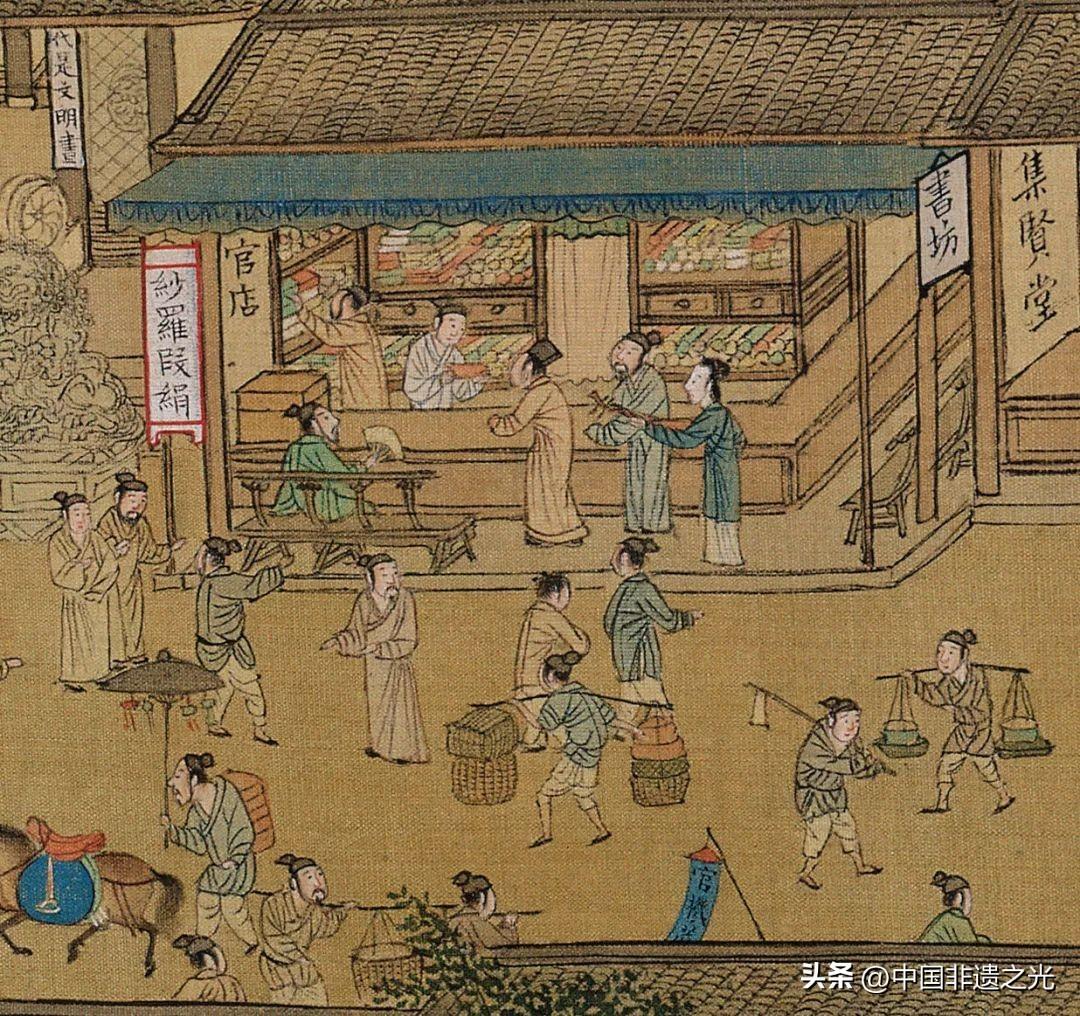 同樣具有浪漫主義情懷的,就是“清明上河圖”了。無論是北宋開封府的繁華,還是明代吳門姑蘇城的熱鬧,都邀請觀衆以平民的眼光觀看歷史上曾經的平民的生活:羅錦匹帛鋪、醜婆藥鋪、描金漆器、裱畫鋪子、酒肆青樓......曾經的生活在尺素上依舊鮮活,這份迷人的魅力穿越千年歷史塵埃依舊栩栩如生地展現在今人面前,怎能不讓人心動?而仇英,作爲一個優秀的職業畫家,也深諳喜聞樂見的題材深入人心的心理,故他的題材總是討巧的。他摹古又不拘泥於“古”,仇本《清明上河圖》便是例子。