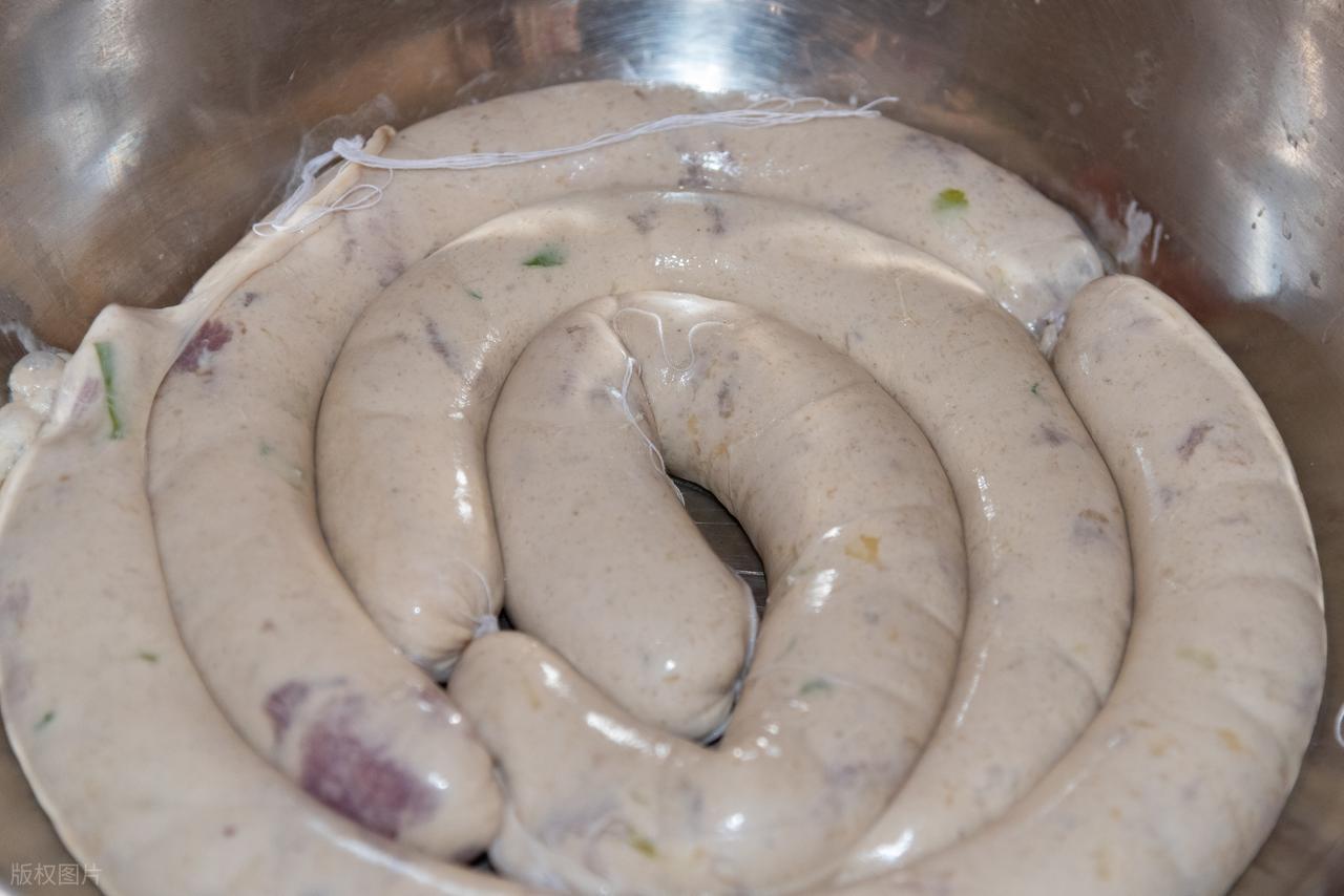 主角是腸衣。那是早已被翻洗得乾乾淨淨、泡得軟軟白白的豬小腸,此刻軟塌塌地盤在另一個盆裏,清水養着,像一握溫順的、等待被喚醒的玉帶。它薄得近乎透明,對着光,能看見那上面細細的、縱橫的脈絡,那是它曾經作爲一件“內臟”的、最後的記憶與尊嚴。而今,它空了,乾淨了,成了一段純粹的、待填滿的“容器”,帶着一種近乎悲壯的順從。