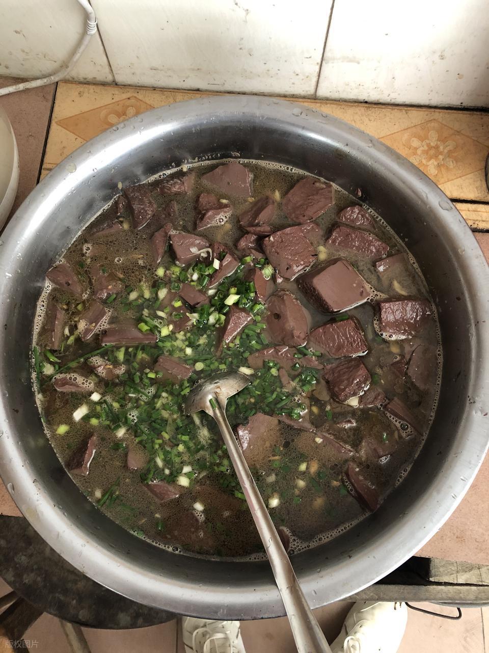 接着是調味。一把晶亮的粗鹽,幾撮磨得極細的花椒麪,一把切得碎碎的、碧瑩瑩的蔥末,有時還灑些姜茸。佐料一入,她便用那雙青筋微凸的手,探入血中,開始攪拌。那攪拌的姿勢很是奇特,不是胡亂地攪和,而是手腕帶着手掌,順着一個方向,沉穩地、一圈一圈地,將那些味道、顏色、生的腥氣與熟的醇香,都圓融地、無間地調和到一處去。血在她手下旋轉起來,那沉鬱的暗紅裏,便漸漸浮起了星星點點的翠綠與薑黃,像無星的夜空裏,忽然錯落地亮起了些微的燈火。