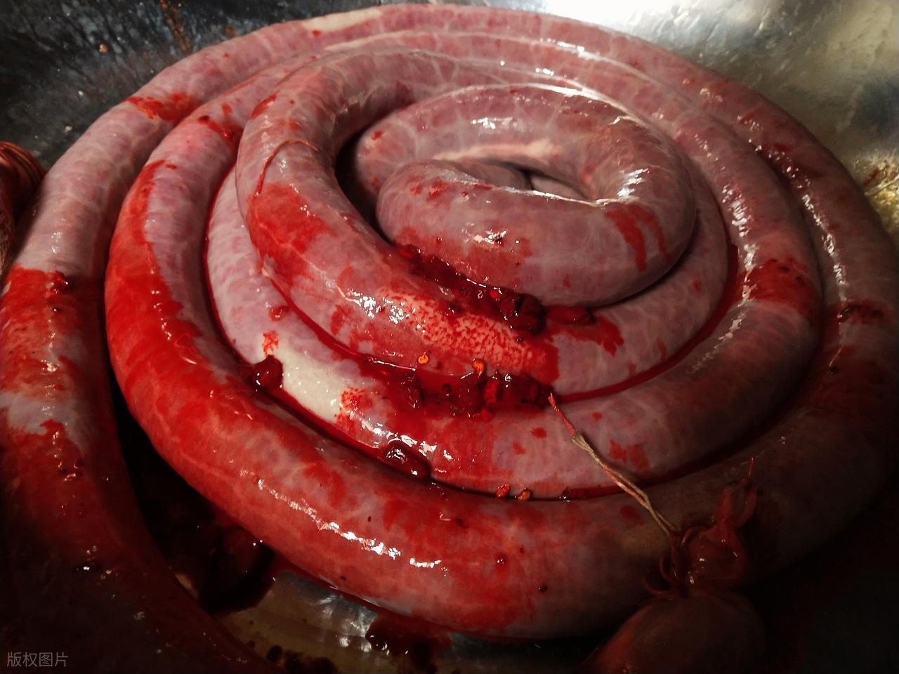然後便是灌了。取一根細竹管,或是用舊了的鋼筆管子,將腸衣的一端小心地套上去,用細線紮緊了。另一端呢,外婆會用一根筷子夾着,虛虛地封住口。她舀起一瓢調好的血,緩緩地、不疾不徐地,注入那腸衣裏去。這是一樁極需耐性的活兒。灌得快了,腸衣容易破;灌得猛了,裏頭的血有了氣泡,煮時便要鼓脹開來。須得是那般的勻,那般的穩,讓那溫熱的、調好的生命之漿,服服帖帖地、一寸一寸地充盈那段空茫的白色長廊。外婆的手極穩,那血線便也極穩,不急不躁地流淌着。腸衣眼見着飽滿起來,由一段蒼白的、無生氣的皮囊,變成了一截飽滿的、紅潤的、沉甸甸的實體。它有了形狀,有了內容,甚至,有了一種謙卑而滿足的“飽腹感”。