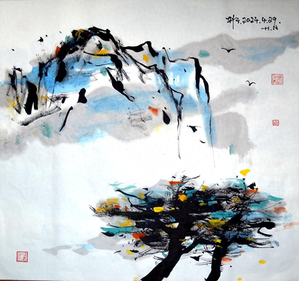 給你四兩水墨,看你是否可以達到撥千斤的效果呈現出來,有道是講究在每一筆的擇優篩選上,力求精準的畫在畫面恰當的位置上,把情感、情緒表達在視覺符號語言筆觸裏,讓腦子裏浮現出筆未到意已到的形態,或是清楚的或是模糊的或是模棱兩可的。藝術表現就是出一道填空題讓你來填空來回答,這就是藝術表現的感染力之強調所在,就是把你融入其中,沉醉其中而流連忘返。