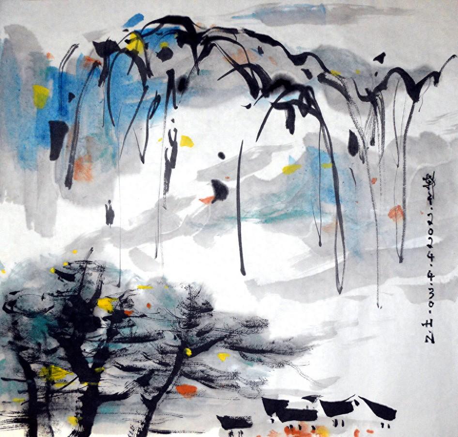 在陡峭的山峯翠綠的松柏樹下映襯着白牆黑瓦零散的幾戶人家,彷彿是在點綴着人與自然和諧的樂章符號般的顯現着,給人於點到爲止恰到好處的感覺。我們人類出現在地球上從某種意義上講就是點綴而非主導,極爲微不足道,甚至無足輕重。就像藝術表現存在一樣,是我們生活意義上精神上的點綴,強調、豐富理想化,使得我們在具有激情與美好的期待中有尊嚴的活着。