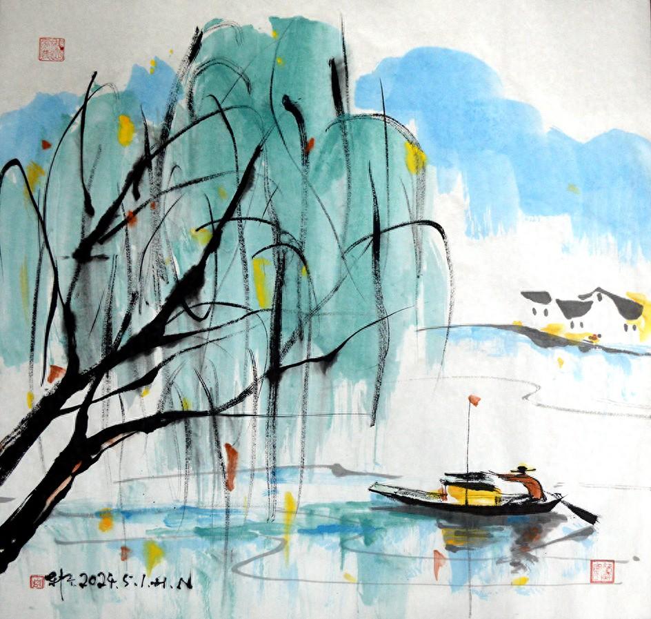 楊柳青青江水平,聞郎江上唱歌聲。東邊日出西邊雨,道是無晴卻有晴。詩句中溢出畫面滿滿的情懷,深深的情意綿綿,好詩,經典又朗朗上口。繪畫藝術表現也應該達到如此這般境界與內涵吧,不然太遜色了,從意境、思想、藝術表現力或者是從藝術的才華上來講,人家抒的是情,我們的繪畫抒的是什麼,抒的是功夫和繪畫技法應用,可見之間有着天壤之別,一個是智能體現,一個是低能表達,完全不在一個藝術表現的境界層次上。但是,我們的繪畫依然還是煞有介事的、大言不慚的表現出是文化的代表藝術的楷模,作品的畫面裏充滿了技法的炫耀卻唯獨感覺不到一點美的感覺呈現出來讓人一飽眼福。