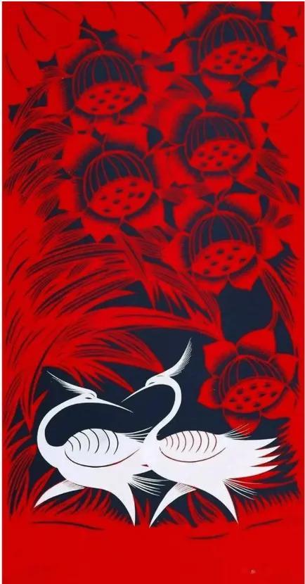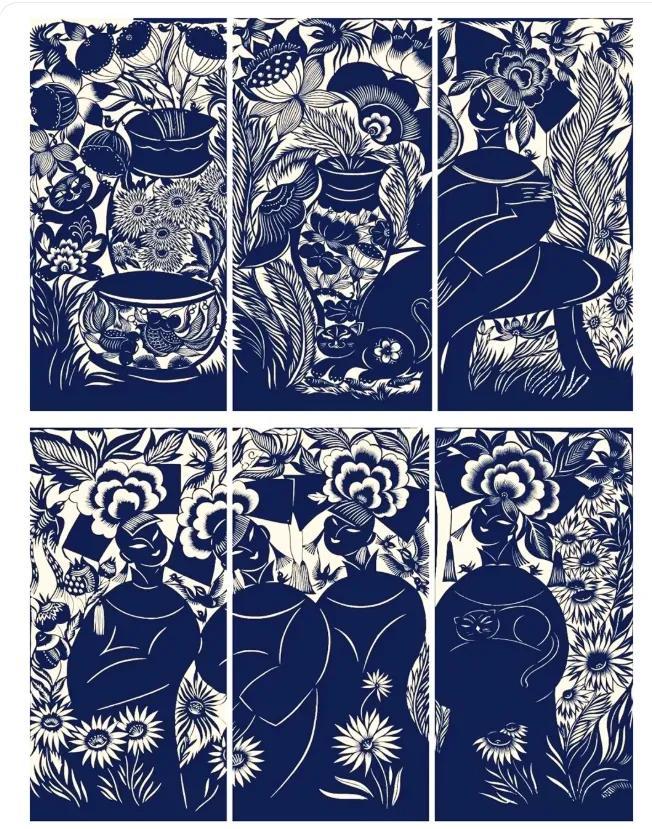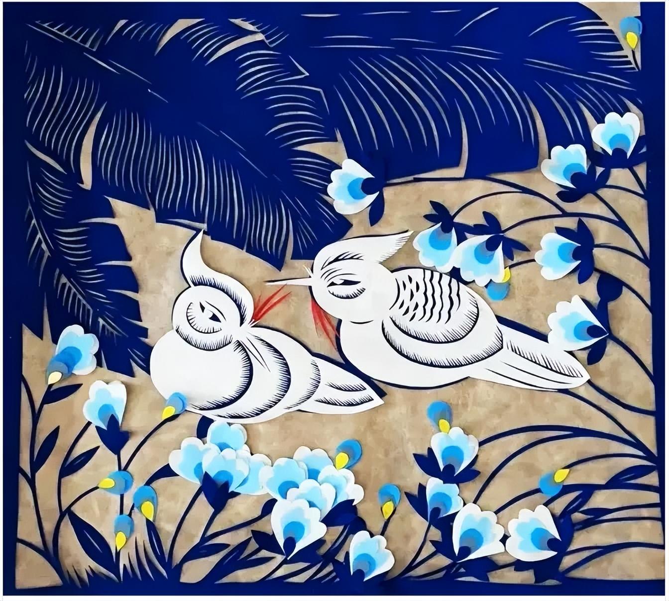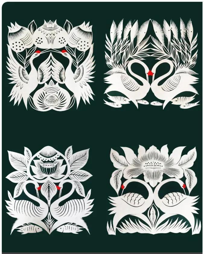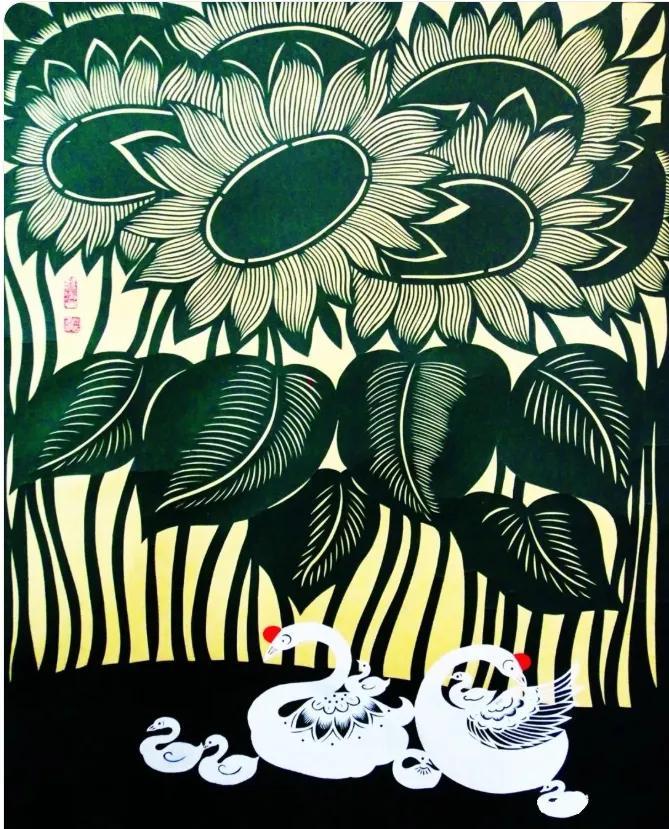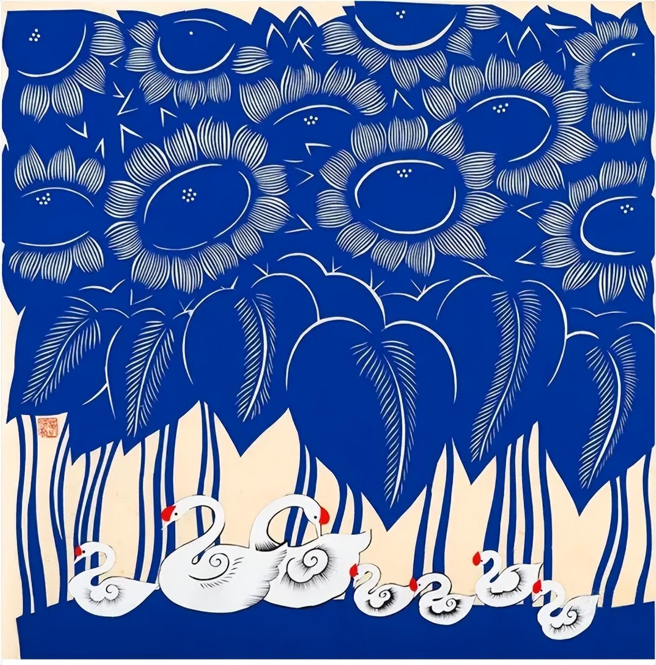 這幅溫馨的畫面中,上半部分以層疊的向日葵爲主體,花瓣的線條細膩如絲,藍底白紋的撞色讓花卉的蓬勃生機躍然紙上;下半部分則描繪出天鵝羣棲的悠然景緻,蘆葦線條簡潔,天鵝圓潤柔美,整體構圖疏密有致,盡顯剪紙藝術的刀工與巧思。