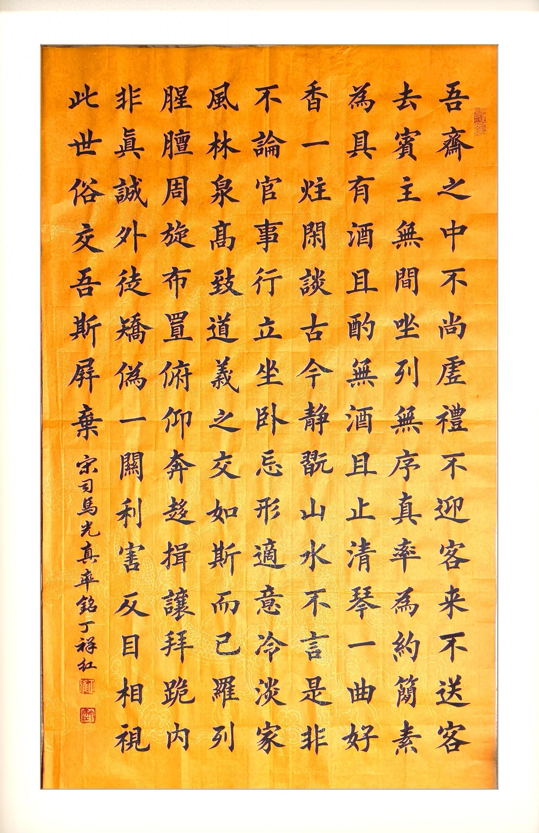 吾齋之中,不尚虛禮。不迎客來,不送客去。賓主無間,坐列無序。真率爲約,簡素爲具。有酒且酌,無酒且止。清琴一曲,好香一炷。閒談古今,靜玩山水。不言是非,不論官事。行立坐臥,忘形適意。冷淡家風,林泉高致。道義之交,如斯而已。羅列腥羶,周旋佈置。俯仰奔趨,揖讓拜跪。內非真誠,外徒矯僞。一關利害,反目相視。此世俗交,吾斯屏棄。