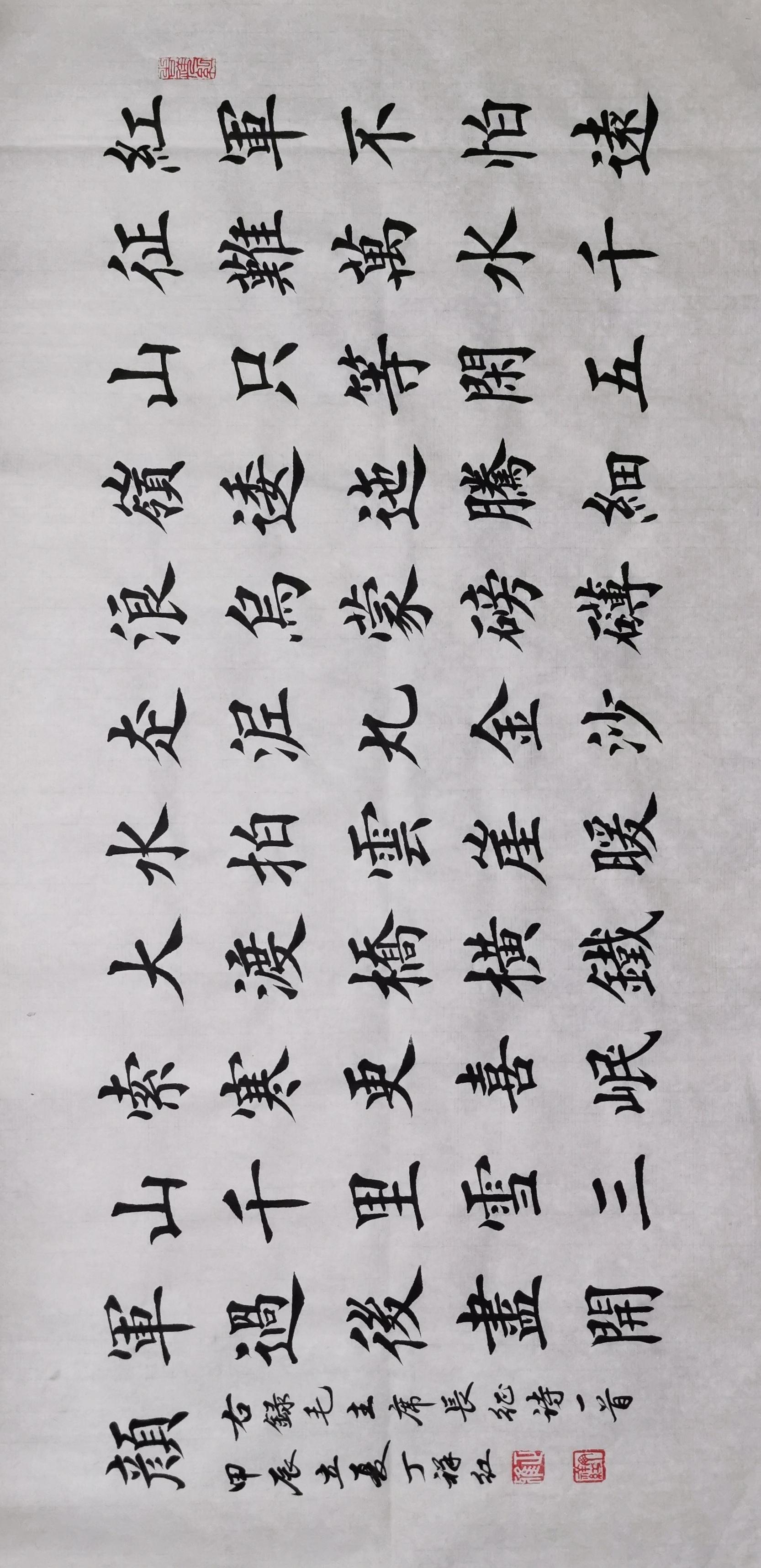 紅軍不怕遠征難,萬水千山只等閒。五嶺逶迤騰細浪,烏蒙磅礴走泥丸。金沙水拍雲崖暖,大渡橋橫鐵索寒。更喜岷山千里雪, 三軍過後盡開顏。