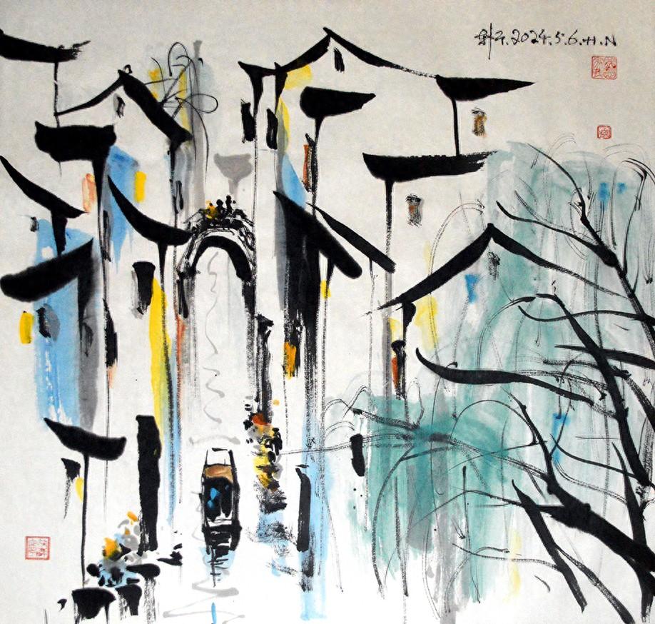 我們的情懷深厚濃郁是藝術創作表現的基石、糧倉、發源地,如此源源不斷的從我們的筆端歡快的流出來,成爲詩歌成爲畫卷成爲美妙的樂章。每次的創作都是竭盡所能如同心靈的表白與吟唱展現心情無量的激盪,像圈圈漣漪一樣在宣紙上渲染化解開來,似乎是水到渠成那樣暢順的自然而然;水墨交融,融會貫通,呈現出藝術表現的主觀裏面的客觀性現象。