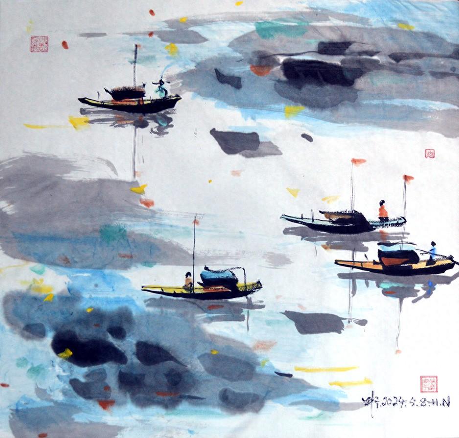 清澈的湖水碧海藍天,幾隻小船在水面上盪漾,偶然之間看到船伕撒下漁網,然後慢悠悠的收回來,只見網裏幾條大小不均的魚兒掙扎着撲騰着,人在這自然和諧不緊不慢的生活節奏之中彷彿增添了濃濃的詩情畫意。在生活的常態化意識裏就是這樣小打小鬧,一切都是局部的小的動靜形成了生活之中鮮活生動的氣象萬千而不失以整體與完整。