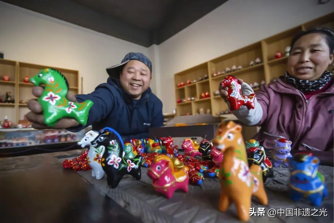 張俊閣與妻子展示泥塑五福彩馬 畢興世 攝