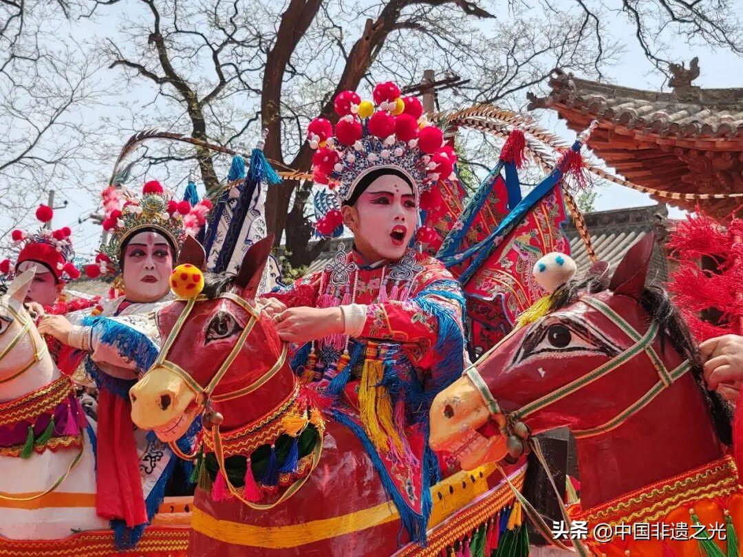 壽陽高蹺竹馬戲是發源于山西省晉中市壽陽縣平頭鎮郭家溝村的民間戲曲劇種,2008年被列入山西省非遺代表性項目名錄,至今已有700多年的歷史。它由當地儺舞、愛社、蚩尤戲演變而來,清代以後受戲劇影響,去掉面具,轉向了人物戲劇化。如今,該劇種有《唐朝八大將》《三英戰呂布》《金沙灘》等劇目流傳,演唱曲調有《山坡羊》《馬腔》等,接近山歌調,半說半唱,根據劇情需要大多爲武將角色。演員面部化妝,身着舞臺服飾,前後扎竹製馬架,腳踩半截高蹺,組成一組組豐富多彩的武打戲劇場面。表演時,演員腰間繫着的竹馬由竹皮扎骨、彩紙裱糊、彩繪裝飾,馬頸掛鈴鐺,馬鞭綴彩穗。演員一手勒繮繩,一手持槍戟,不時有“上坡前傾”等高難度動作,象徵着英勇、力量和忠義。馬蹄聲與鈴鐺聲交織,彷彿真馬奔騰,熱鬧非凡。