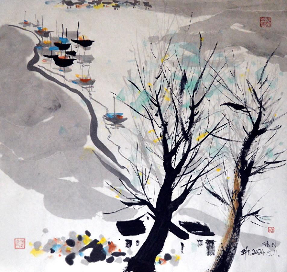 樹的從容不迫,船的淡定自得,人的囂張跋扈,柔和在一起再切片來看一看,形態雖然各異但是協調一致而且有序。我在自然裏,自然且在我心中的一種自然觀、自然的感受畫卷。在自然裏帶有強烈的“野蠻”、“任性”基因元素,抓住這一特徵屬性藝術性的強調出來,形成繪畫表現的語言符號,彰顯出其個性和語境的腔調,來個像似唱秦腔那樣的歇斯底里完全釋放是情是意或者是什麼也不是的釋放,圖的是個痛痛快快的撕心裂肺。