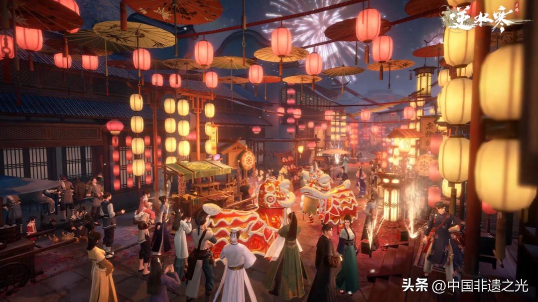 除此之外,年輕人也一改往年春節線下走親訪友的習俗,開始通過電子紅包和線上拜年等方式“過線上春節,走賽博親戚”;隨着電視劇《太平年》熱播,遊戲《逆水寒》《燕雲十六聲》等也推出了宋代元日的場景,讓玩家們在遊戲裏與好友共放虛擬煙花,體驗傳統新春民俗魚燈會、舞獅巡遊,在數字世界中感受傳統年俗。