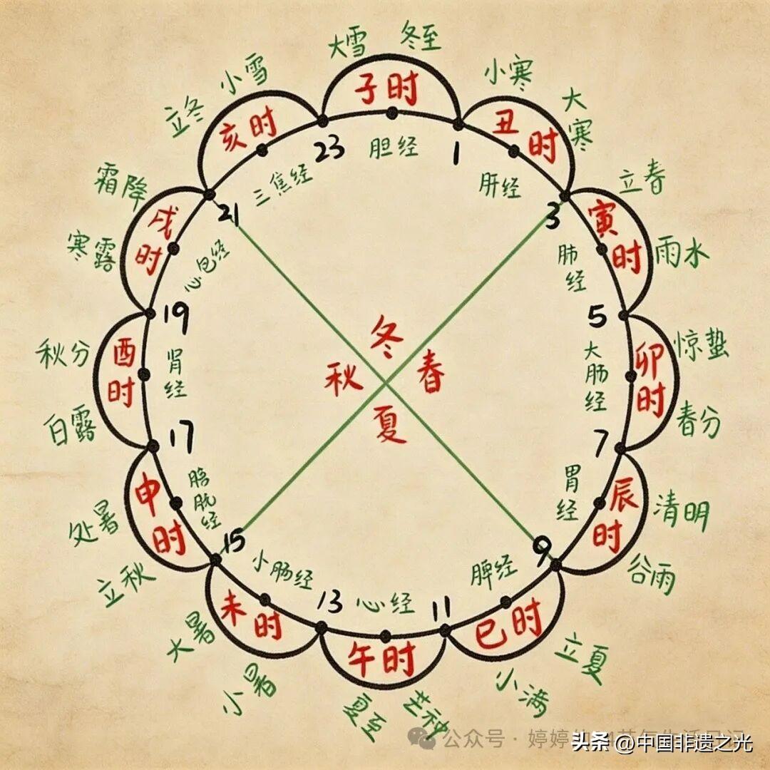 一日分爲十二時辰,對應十二地支,可視爲一天之中的“小節氣”。二十四節氣掌管一年的陰陽消長,十二時辰支配一日的陰陽起伏,二者共同構建起“順時、順氣、順勢”的生活準則,成爲傳統作息、飲食養生、情志調養的基礎。