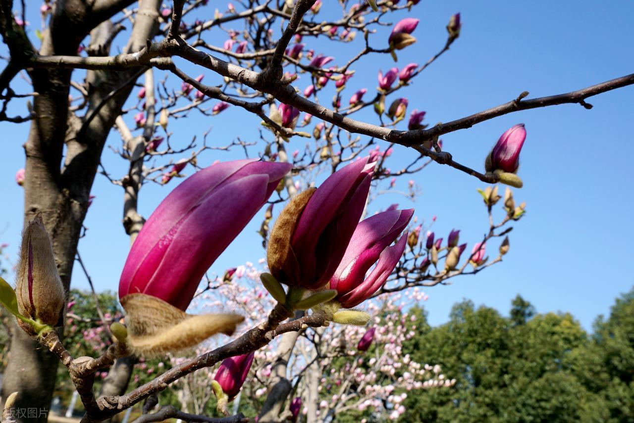 而在一旁,紅玉蘭則是另一番光景。它的花色從淺粉到深紫漸變,層層疊疊,熱烈得如同燃燒的晚霞。若是說白玉蘭是水墨畫裏的留白,那紅玉蘭便是工筆重彩的濃淡相宜。紅玉蘭的花苞往往更緊實,綻開時稍顯緩慢,卻更顯飽滿,每一片花瓣都透着勃勃生機,透着一股張揚的生命力。