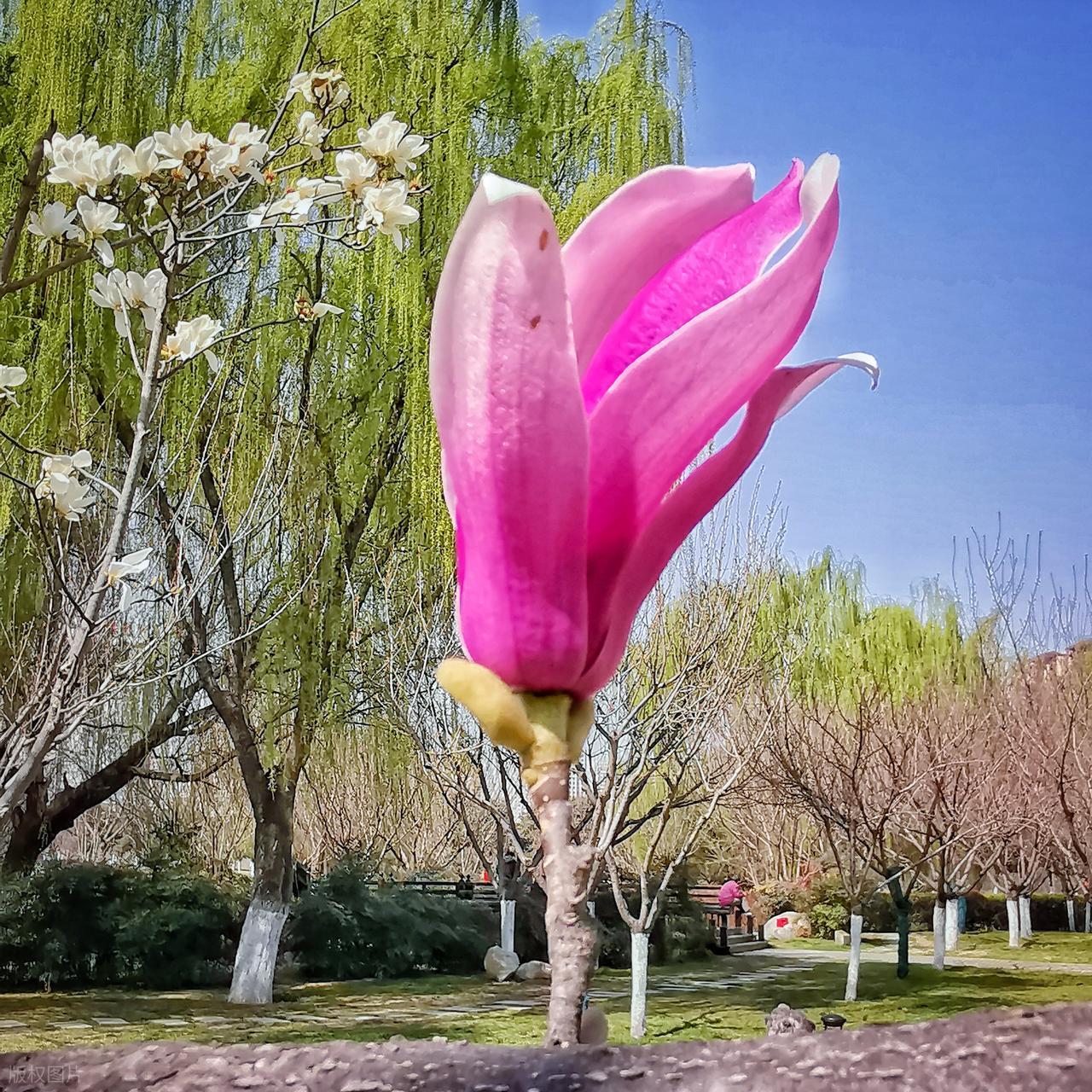 這兩種玉蘭,一素一豔,一靜一動,卻在春日裏相映成趣。它們在枝頭盛開,不卑不亢,不爭不搶,卻以最驚豔的姿態,點亮了整個春天。站在花樹下,仰望着這滿樹的繁花,彷彿能觸摸到春的脈搏:那是溫潤的,是蓬勃的,是萬物復甦時最動人的交響。