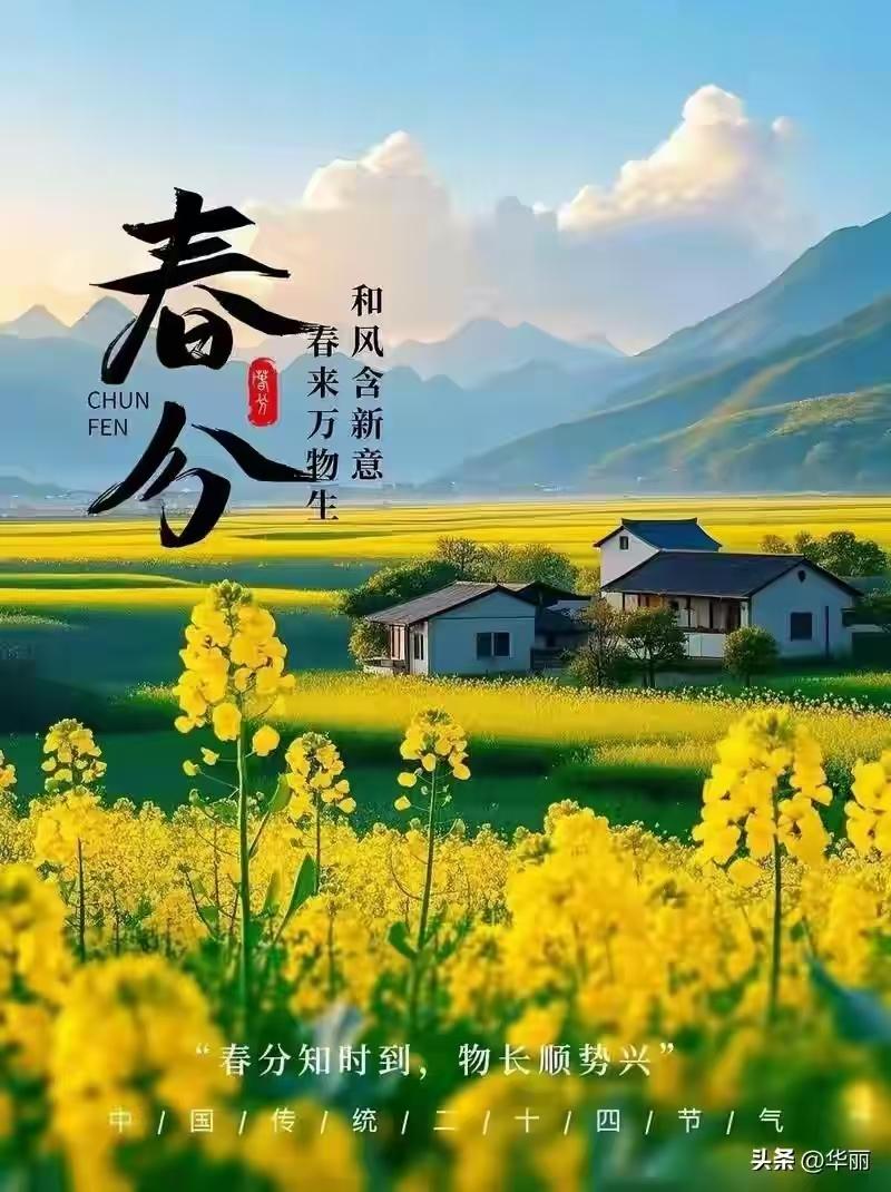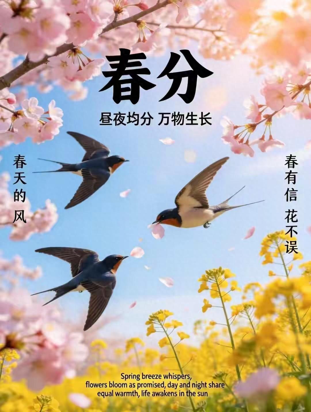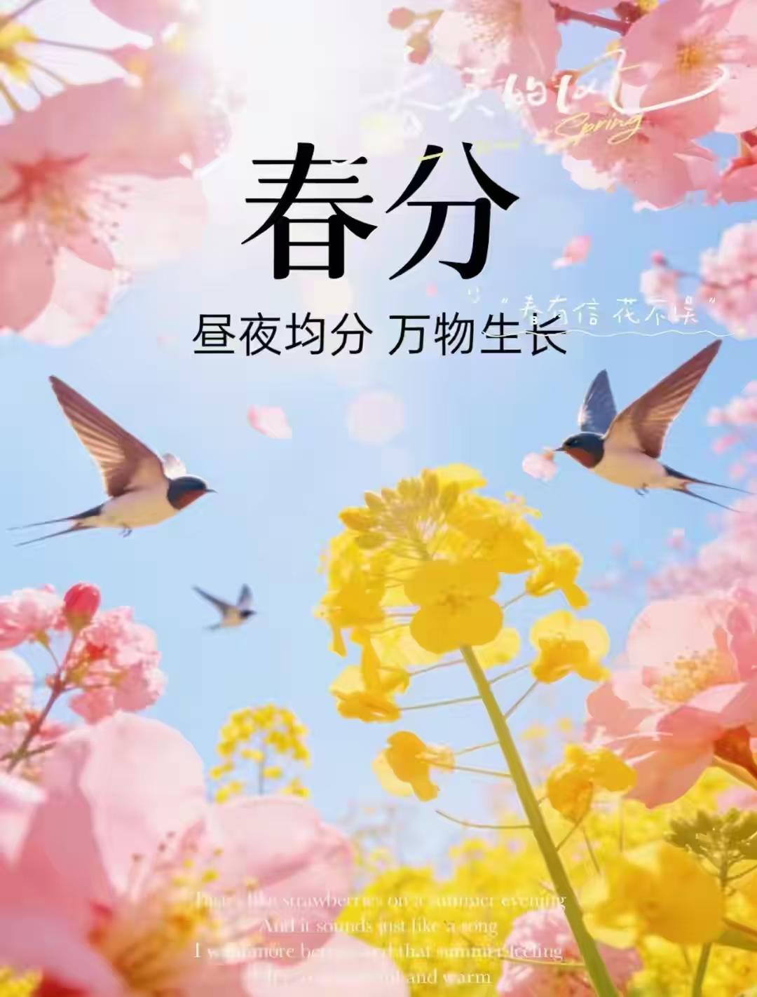晝夜均分,春色平分,萬象昭蘇。望長天澄碧,雲輕日暖;平川疊翠,柳嫩煙浮。杏雪盈坡,櫻霞滿嶺,金浪油菜接遠疇。和風裏,聽鶯啼燕語,妙囀清悠。