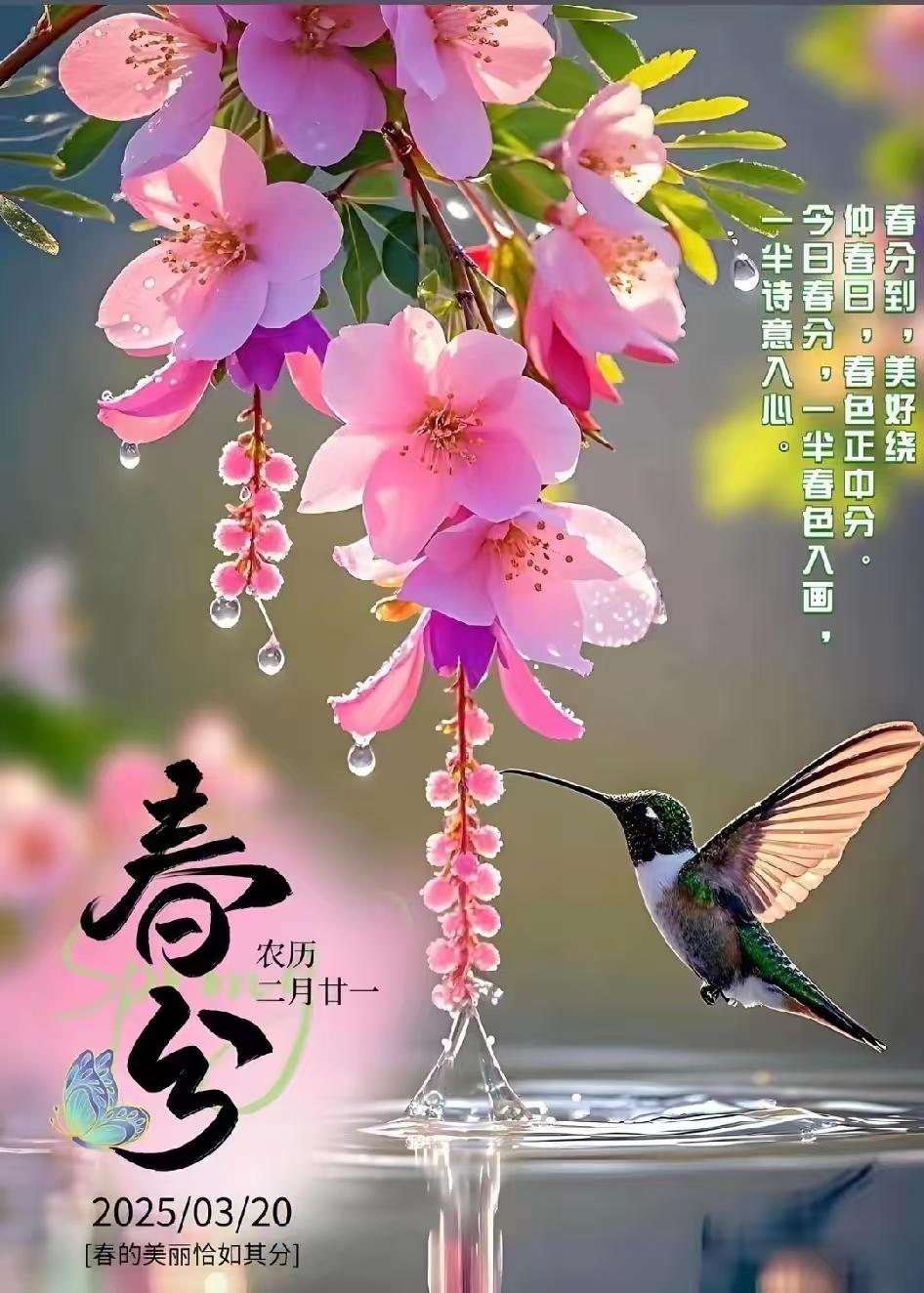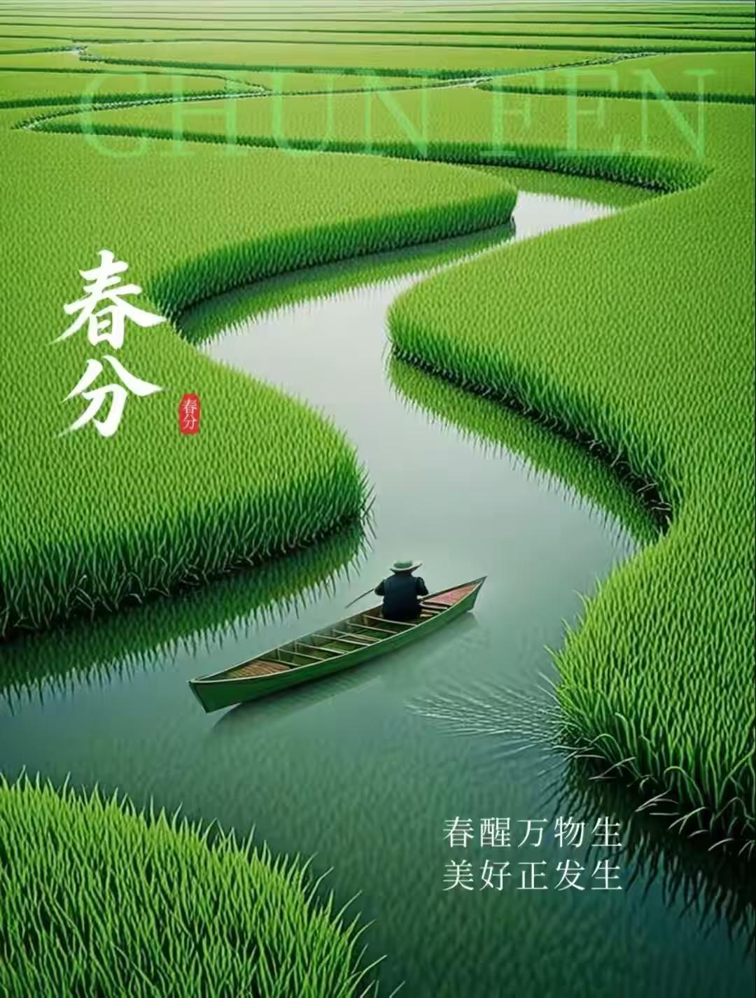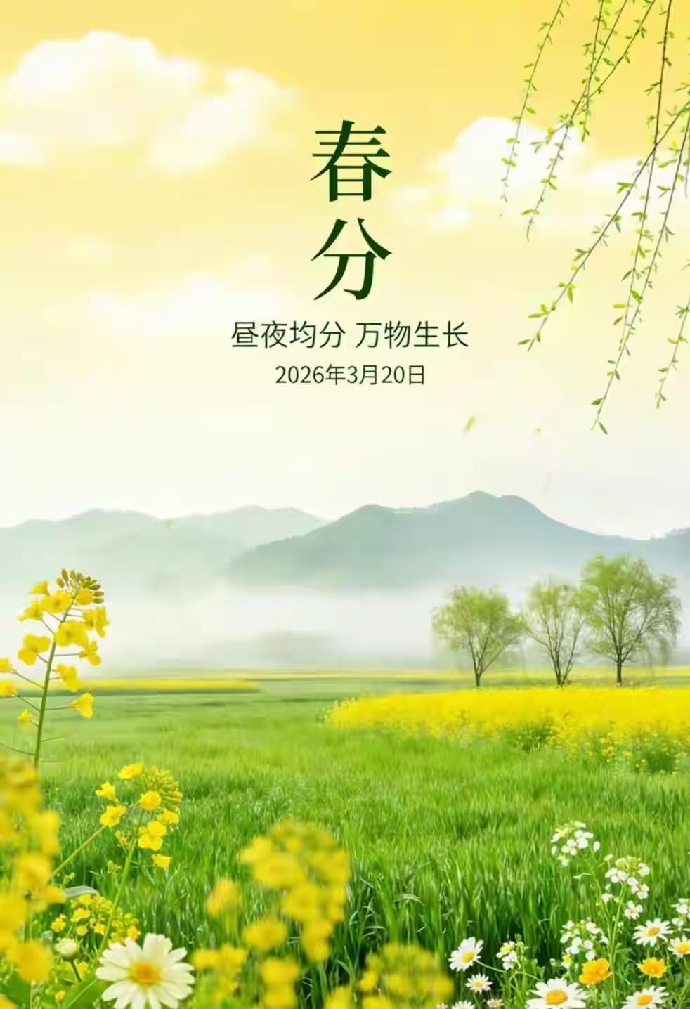 晝夜均分,春色平分,萬象昭蘇。望長天澄碧,雲輕日暖;平川疊翠,柳嫩煙浮。杏雪盈坡,櫻霞滿嶺,金浪油菜接遠疇。和風裏,聽鶯啼燕語,妙囀清悠。