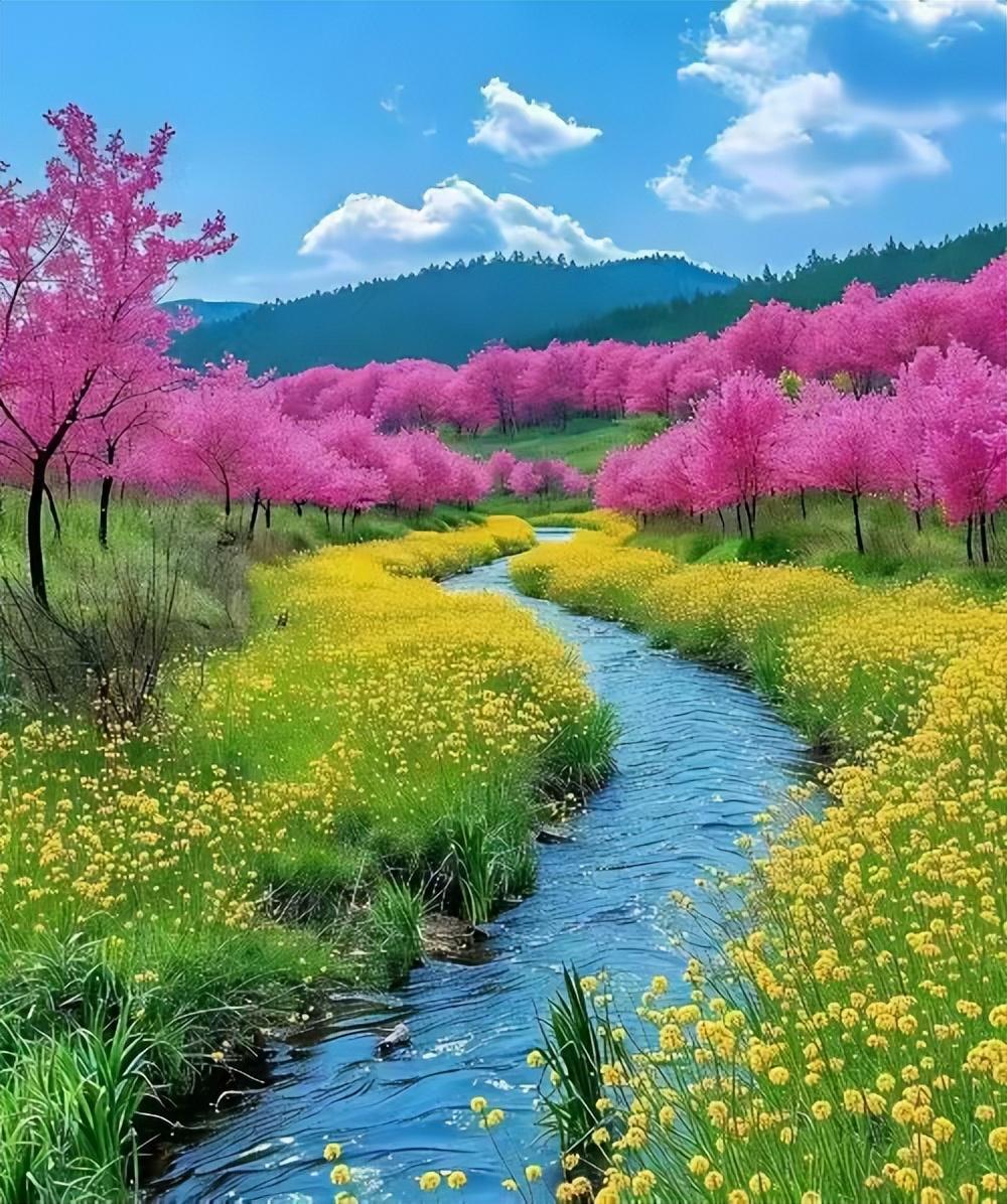 山河盡展溫柔,正大地生機一望收。看溪泉漱玉,波光瀲灩;林巒鋪錦,畫意悠悠。草木含芳,繁花吐蕊,十里芳菲醉眼眸。逢佳節,願人間歲歲,春滿神州。
