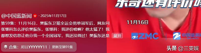 中國藍新聞——11月16日,樊振東衛冕全運會男單冠軍後,網友問張繼科怎麼評價樊振東,張繼科:我評價啥啊?他太猛了!