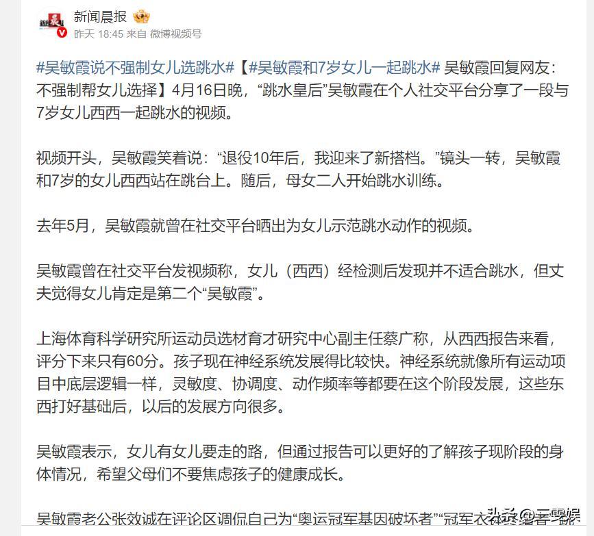 新聞晨報——#吳敏霞說不強制女兒選跳水#
