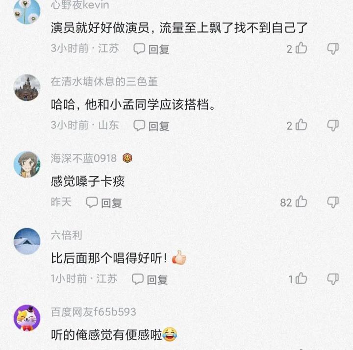 一些網友紛紛:唱的什麼玩意,好難聽,確定不是來表演喜劇的嗎?表情看着挺用力,唱的一塌糊塗,實在欣賞不來,還是安心的拍戲吧,把機會留給專業歌手。