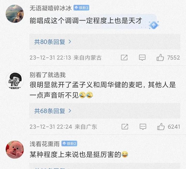 然而,並不是因爲大家在舞臺配合默契,表現亮眼,而是孟子義全程跑調,一句沒在調上,和聲中顯得尤爲突出,就連周華健這樣的實力歌手都帶不動,唱的人勇氣可嘉,聽的人卻覺得尷尬,畢竟這是跨年晚會,而不是綜藝節目。