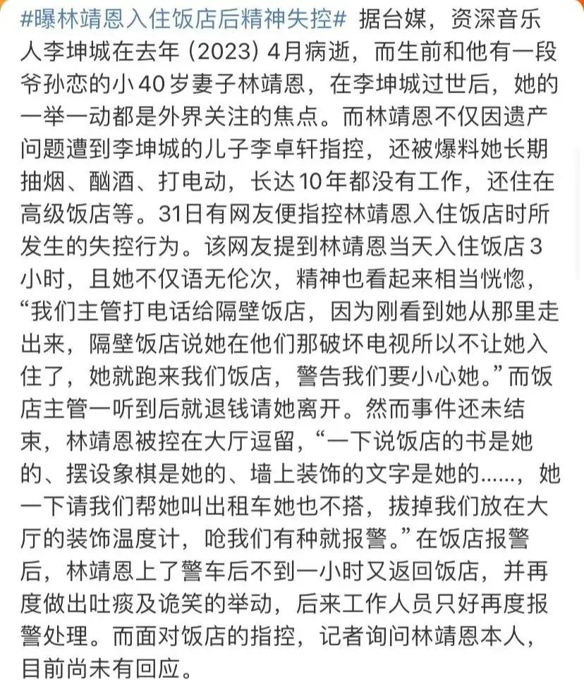 2023年4月,李坤城病逝,兒子李卓軒爲了爭奪財產,列出7大罪狀控訴林靖恩,選擇徹底撕破臉。