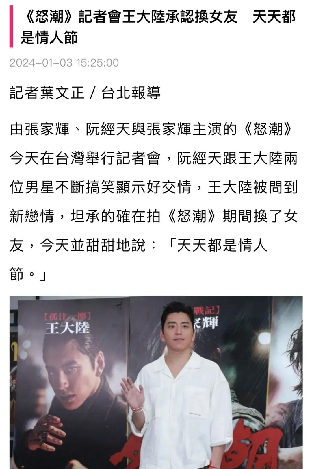 隨後,媒體報道,王大陸接受採訪時承認與蔡卓宜分手,透露在拍戲期間就已經換了女友,並一臉甜笑的表示,每天都是情人節。