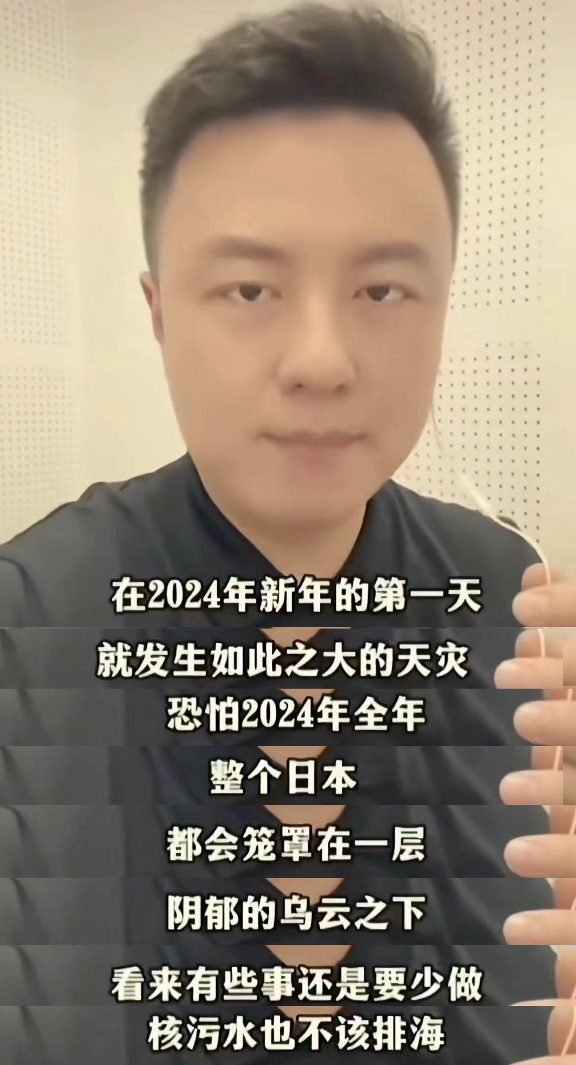 除此之外,在介紹完日本地震的具體情況後,他還在視頻中表示:“在2024年新年的第一天,就發生如此之大的天災,恐怕2024年全年整個日本都會籠罩在一層陰鬱的烏雲之下,看來有些事還是要少做,核污水也不該排海。”