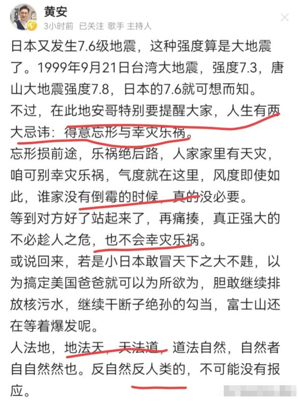 黃安則先是說當別人家裏有天災的時候不應該幸災樂禍,因爲誰都有倒黴的時候,被網友們攻擊後又改口說日本人應該好自爲之,要趕緊懺悔,不要再做危害世界的勾當。