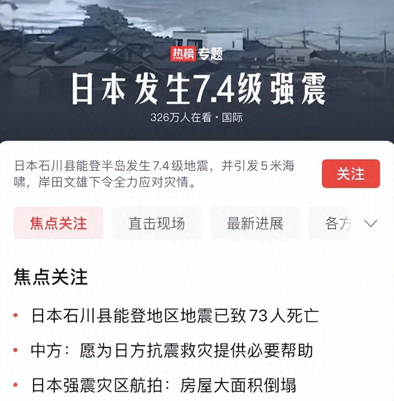 1月1日,日本本州西岸近海便發生了7.4級大地震,導致房屋大面積倒塌,大批民衆傷亡。