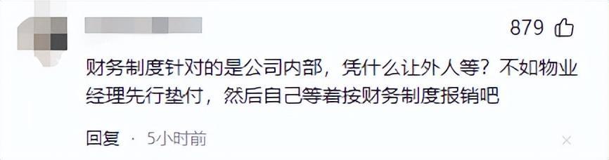 有人一語中的,說財務制度針對的是公司內部,憑什麼讓外人等?不如物業經理先行墊付,然後等着按財務制度報銷吧。