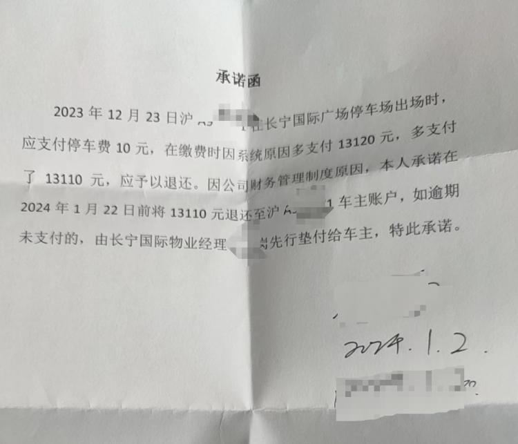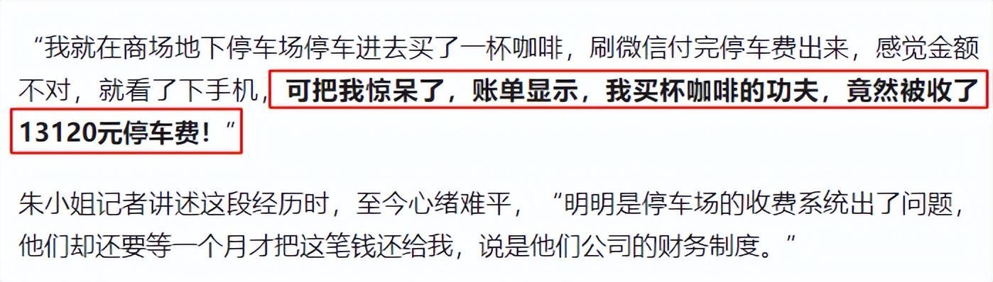 見到朱小姐的賬單後,管理人員也震驚了,因爲照理說朱小姐只停了不到一個小時,只用交10元停車費,也就是說朱小姐被多扣了13110元。