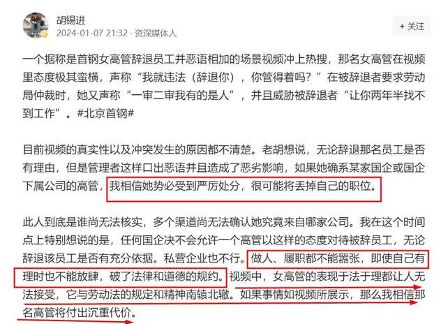 胡錫進直言涉事女高管的表現“於法於理都讓人無法接受,它與勞動法的規定和精神南轅北轍。如果事情如視頻所展示,那麼我相信那名高管將付出沉重代價。”