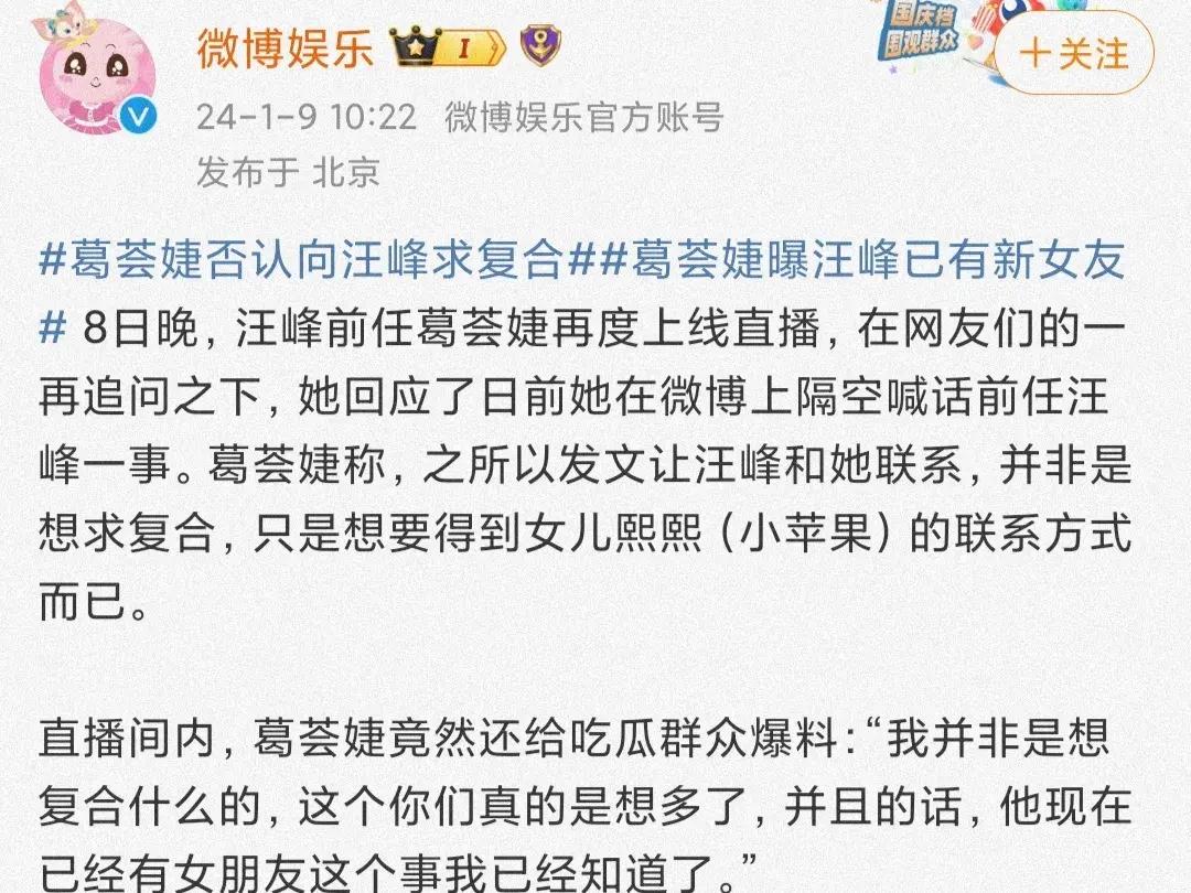 對於此事,葛薈婕回覆網友,稱之所以深夜喊話汪峯,並不是求複合,只是想得到女兒(小蘋果)的聯繫方式而已。