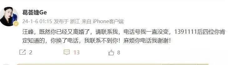仔細一看,這意思是前任沒離婚前,兩人沒有任何瓜葛,如今,想要與汪峯聯繫,並駑定對方記得當初的電話號碼,怎奈汪峯早已換號,無奈在網上喊話。