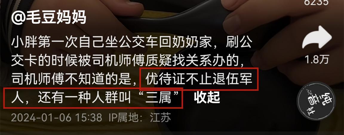 此外,在該視頻的文案中,毛豆媽媽寫道:小胖第一次自己坐公交車回奶奶家,刷公交卡的時候被司機師傅質疑找關係辦的,司機師傅不知道的是,優待證不止退伍軍人,還有一衆人羣叫‘三屬’。