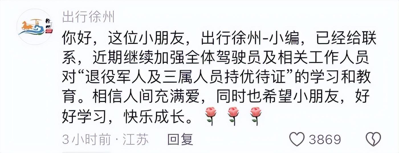 對於此,“出行徐州”官方回應已聯繫公交公司,近期將加強對“退役軍人及三屬人員持優待證”的學習和教育。