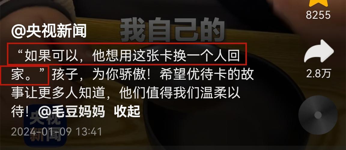 央視新聞轉發了毛豆媽媽所發的視頻,並配文:“如果可以,他想用這張卡換一個人回家。”孩子,爲你驕傲!希望優待卡的故事讓更多人知道,他們值得我們溫柔以待。