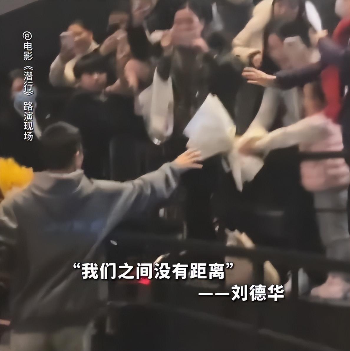 有一場路演因爲觀衆太多,前面的觀衆擠不進去,後面的觀衆看不到劉德華本尊,而且不少粉絲帶着送給華仔的花束,卻遞不到他手裏。