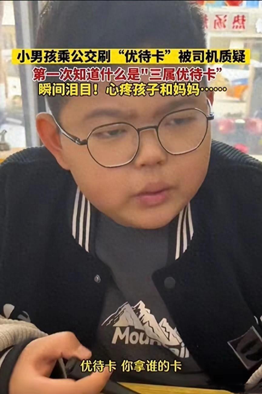 聽到提示聲後,公交車司機質問男孩“優待卡?拿的誰的卡?”