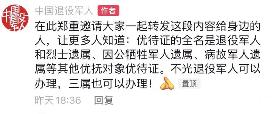 據瞭解,優待證的全名是退役軍人和烈士遺屬、因公犧牲軍人遺屬、病故軍人遺屬等其他優撫對象優待證,不光退役軍人可以辦理,三屬也可以辦理!