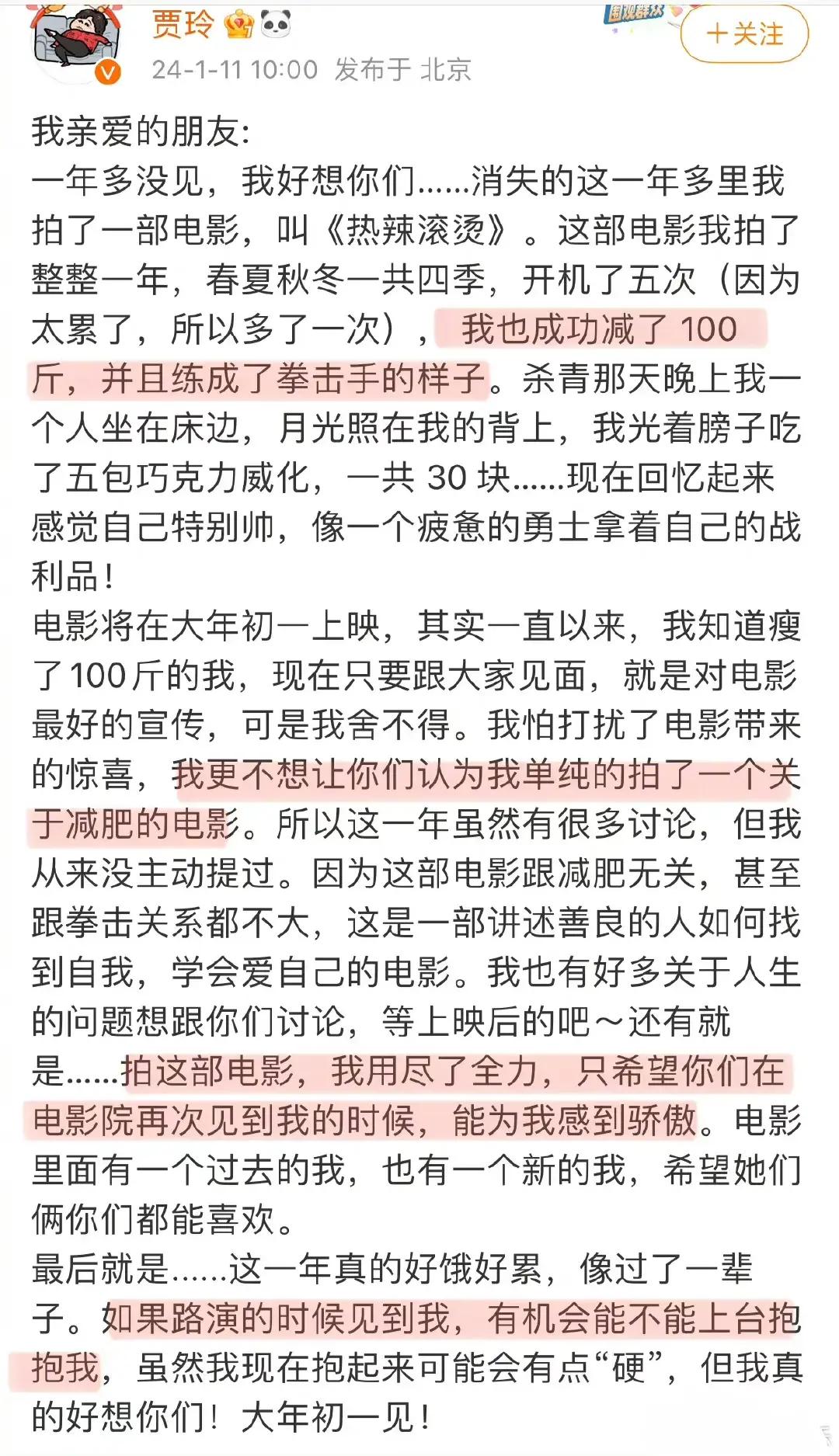 1月11日,賈玲在社交平臺發佈長文,談到爲新電影瘦身100斤,坦言這一年又餓又累,像過了一輩子!