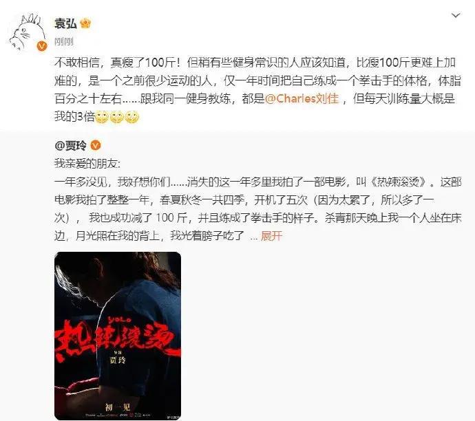 袁弘發文表示不敢相信賈玲瘦了100斤,比這個更難的是練成拳擊手的體格,一個平時不運動的人,體脂百分之十左右,兩人同一個教練,賈玲每天的訓練量要多出三倍。