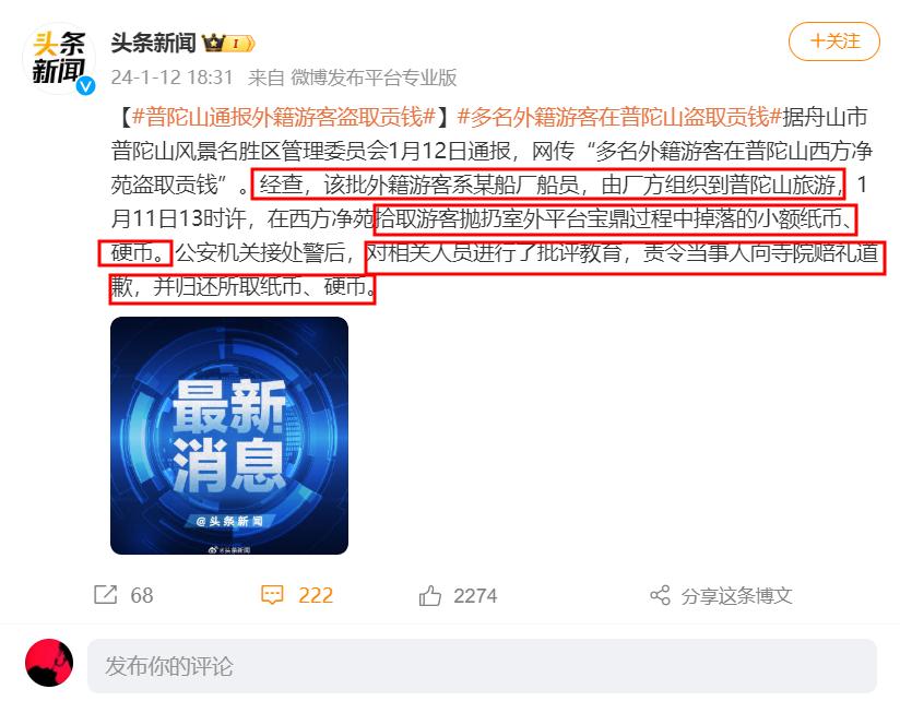 該情況通報也進行了說明,這些外國遊客被警方進行了批評教育,責令他們向寺院賠禮道歉,並歸還所取紙幣、硬幣。