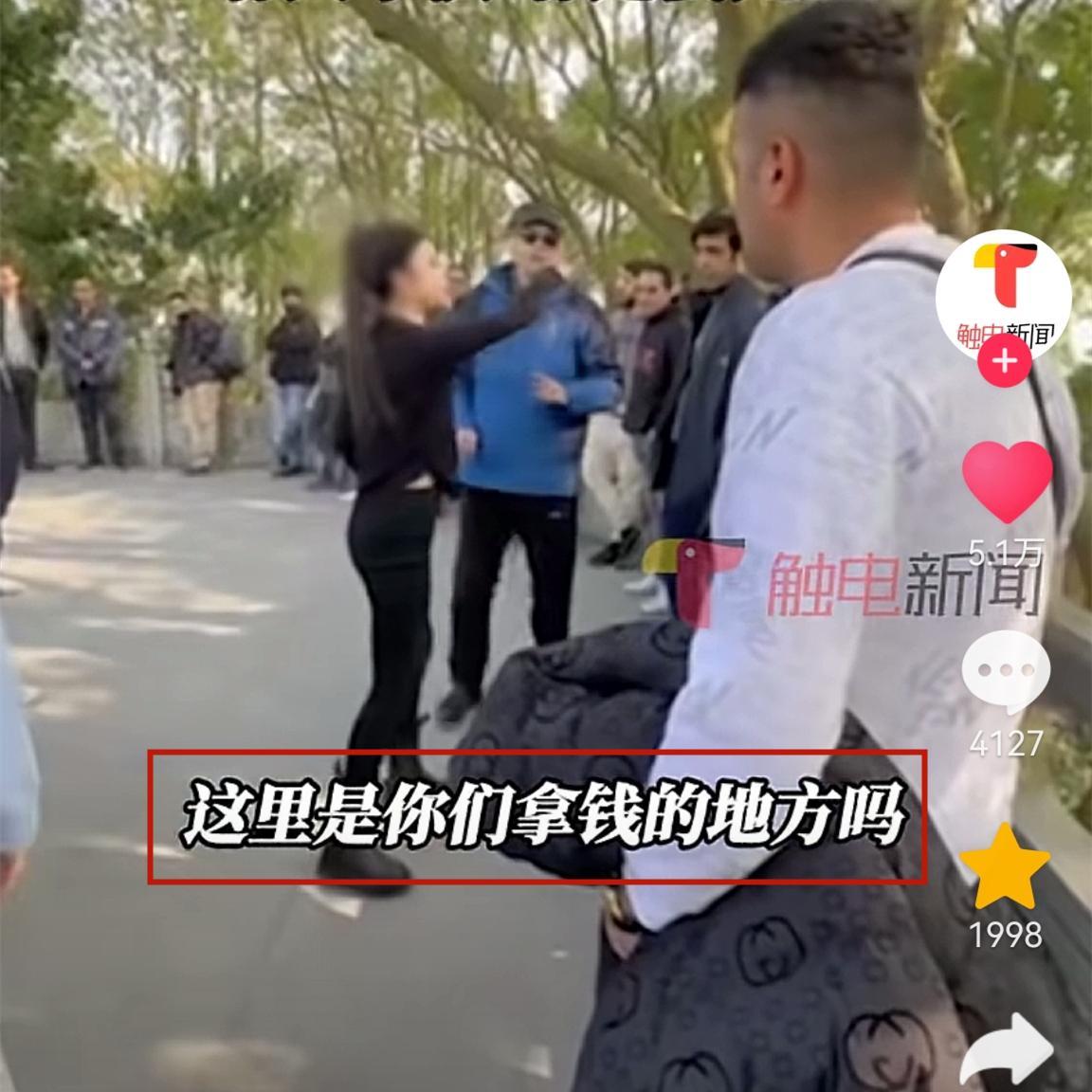 一名一身黑衣的年輕女子走到外國遊客跟前,用手指着他們說:“這裏是你們拿錢的地方嗎?你們一個個,G出中國。”