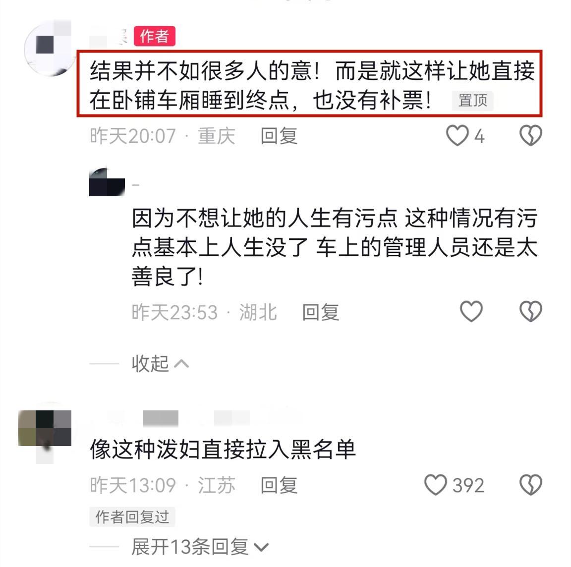 該網友在評論區告訴網友,涉事女子最終在臥鋪車廂睡到了終點,也沒有補票。