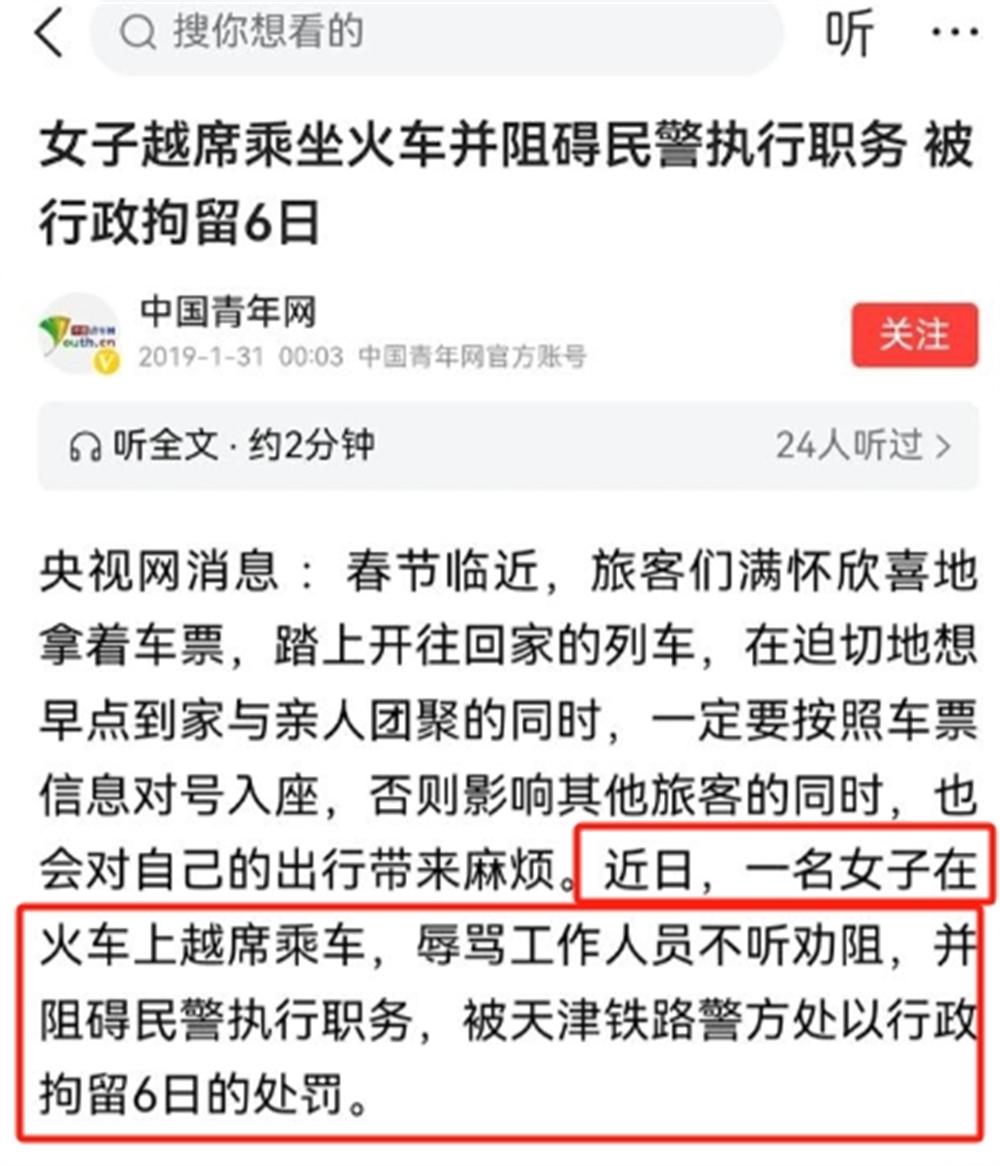 在2019年,就有一名女子在火車上越席乘車,辱罵工作人員不聽勸阻,並阻礙民警執行職務,最終被鐵路警方行政拘留6日。