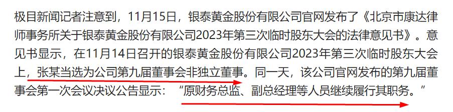 並且銀泰黃金董事會決議公告內容顯示“原財務總監、副總經理等人員繼續履行其職務。”